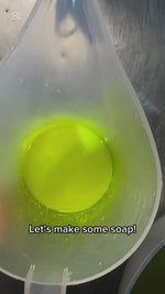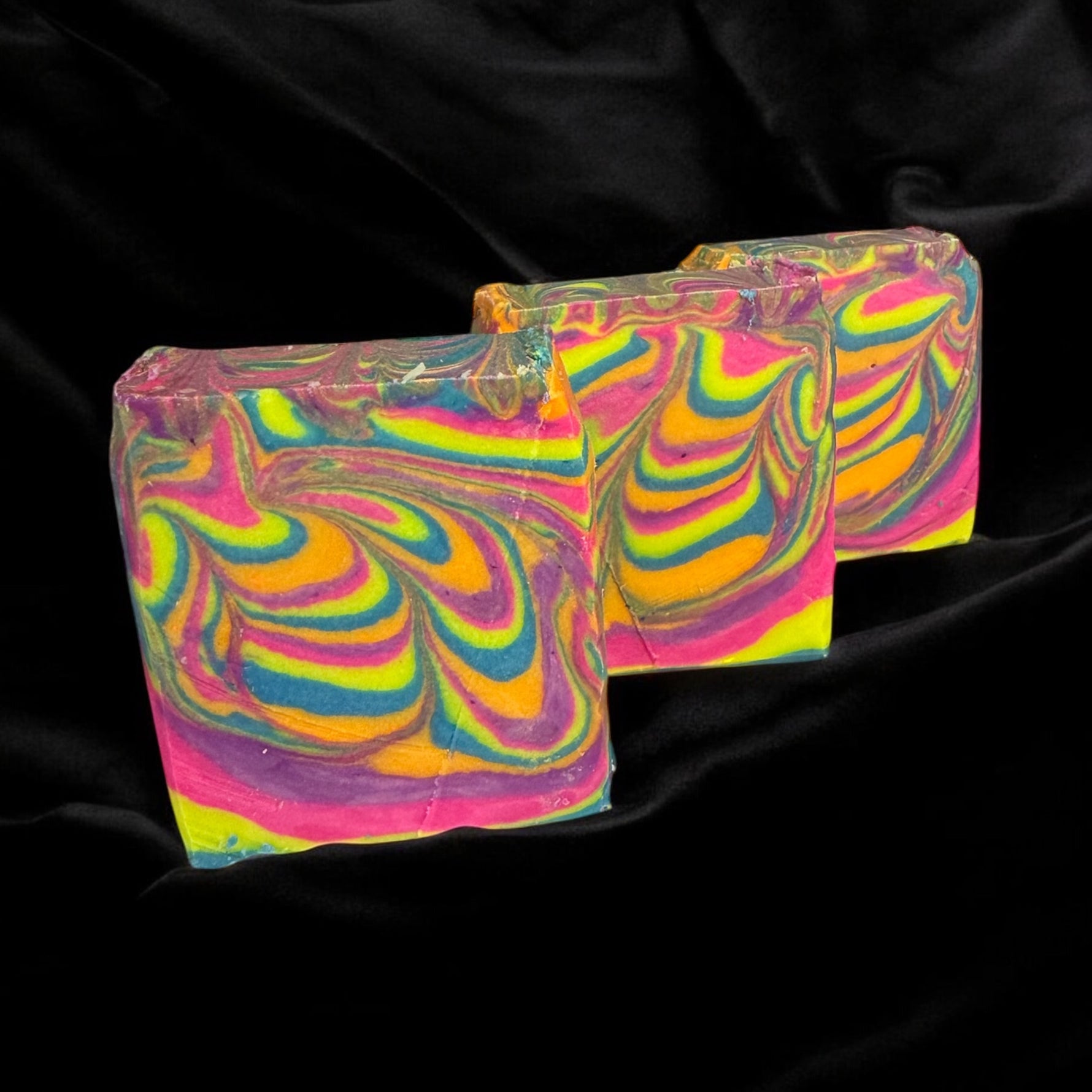 The soap bars are uniquely swirled with neon yellow, pink, purple, blue and orange.